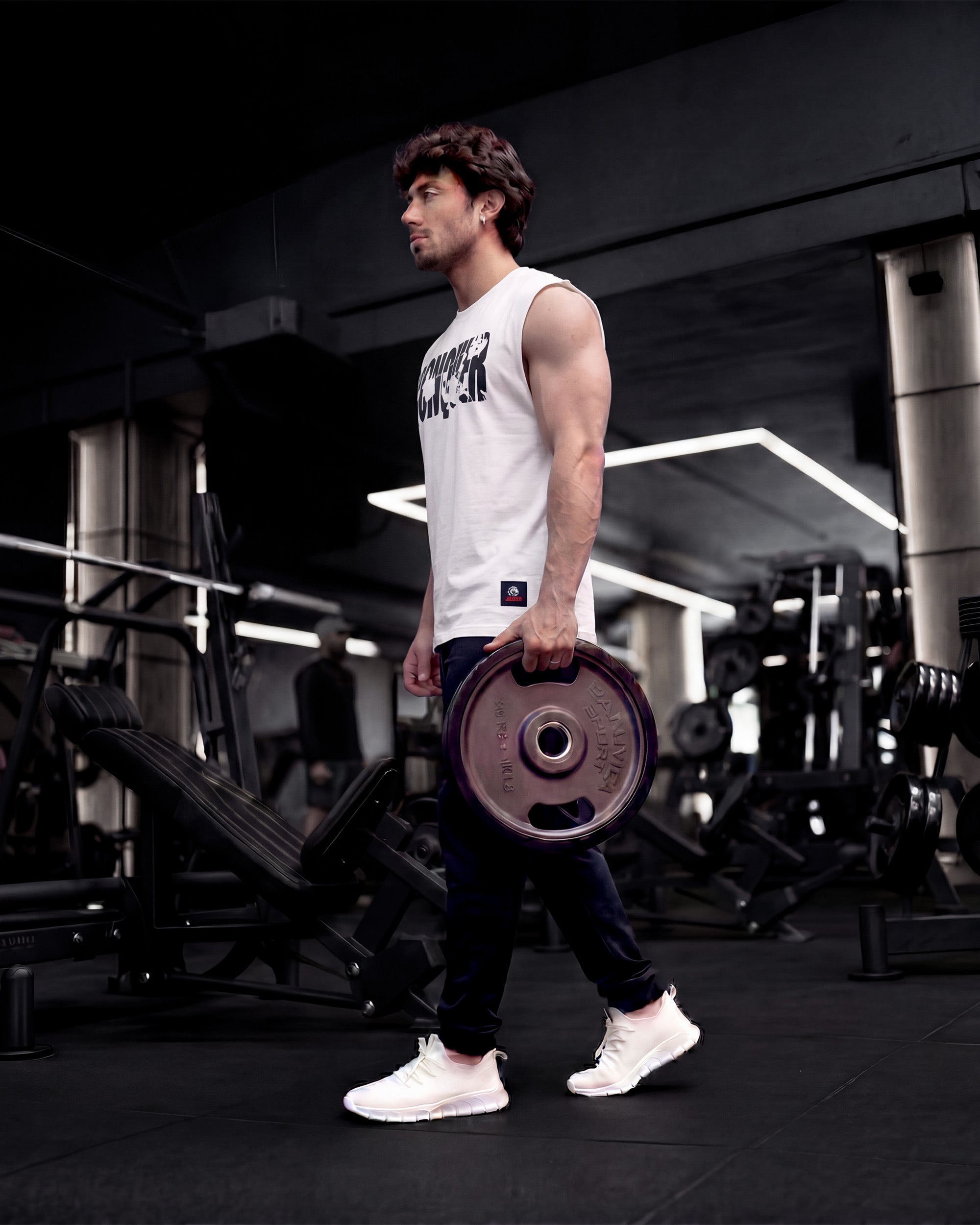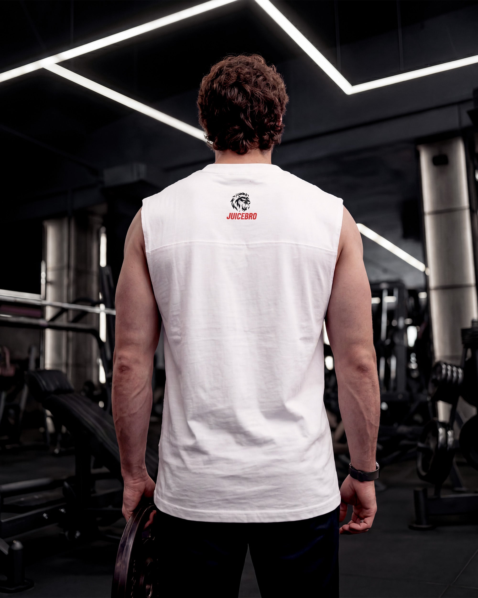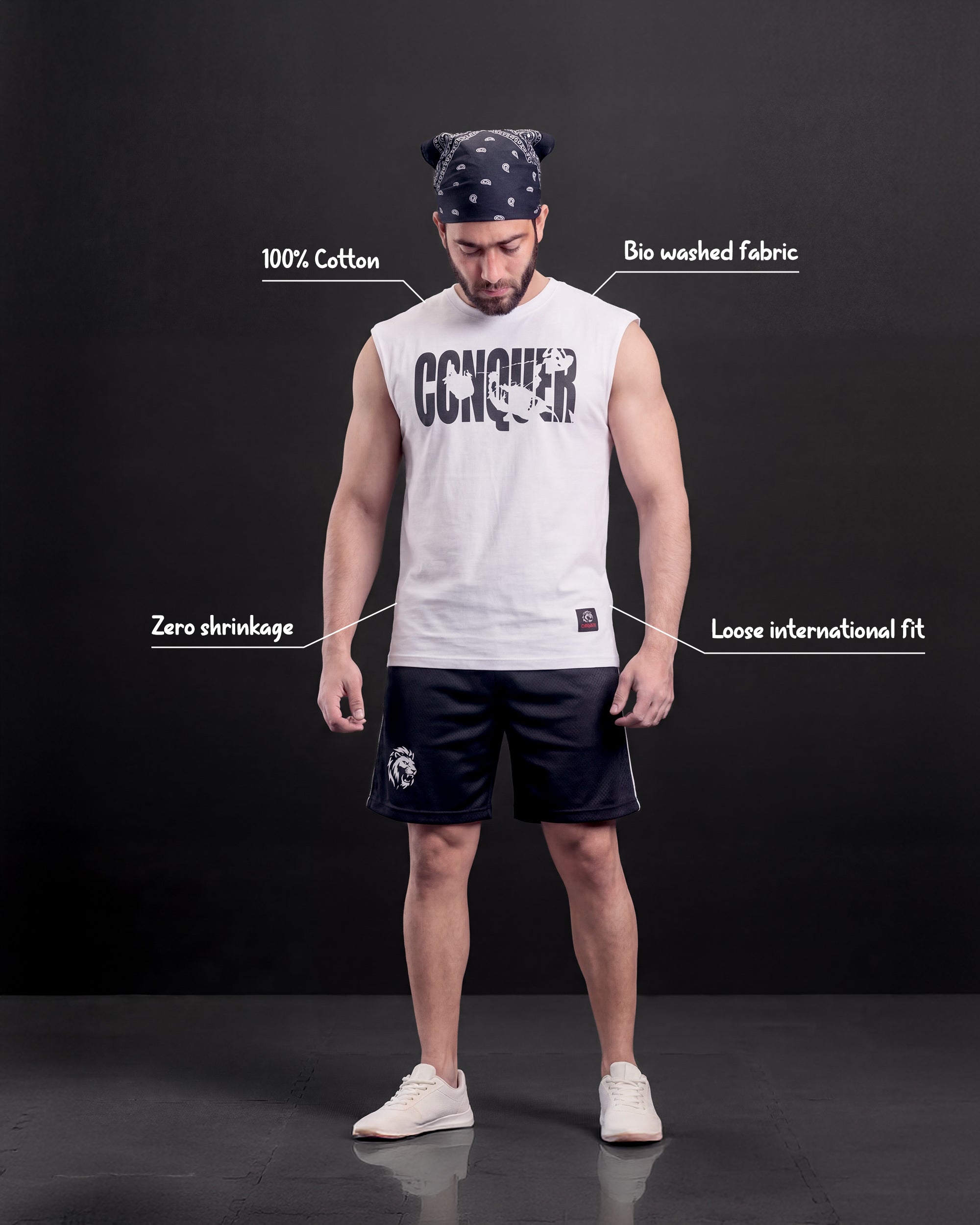 Loose-Fit Men's Sleeveless Tee. Crafted in 100% premium cotton jersey, bio-washed for a smooth feel. With a loose international gym fit, zero shrinkage, fade-proof prints, and color-safe washes, this tee is built to keep up with every rep, every wash, every wear.